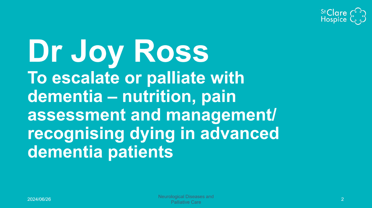 Dr Joy Ross: To escalate or palliate with dementia – nutrition, pain assessment and management/recognise dying in advance dementia patients